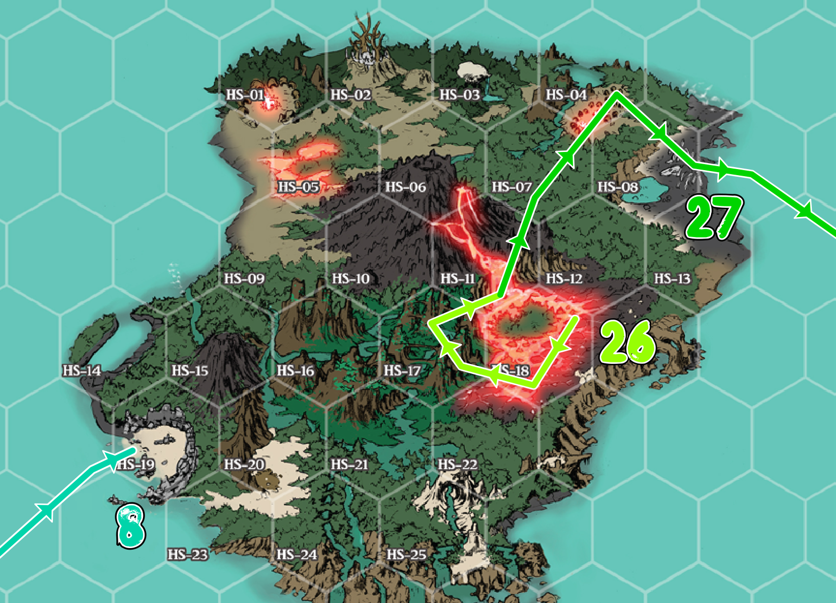 Elle est parcourue de petites fissures, deux doigts de large, desquelles d'élevèent des arabesques de vapeur. Des buissons sont regroupés en bordure de la jungle, formant un sous bois. On entends un petit bruissement, et les buissons se déplacent jusqu’à se mettre au soleil. Avielo identifie des buissons ambulants : ça s'appelle des buissons araignées. Avielo n'a plus rien a manger, donc on décide de chasser un peu. On trouve une plume de Kuji, et quelques traces d'animaux. On trouve un trou, dans un renfoncement sous un arbre, avec des traces de cabiai. Je lui passe une corde pour faire un collet, et vais chercher des grosses racines noires pour faire un appât. On se cache jusqu'a ce que nos proies sortent. On attrape un cabiai, j’abrège ses souffrance promptement. Les petits sortent un couinant, puis se cachent dans le terrier : je les suis pour les achever. On dépèce la bête, on découpe la viande et on sèche tout ça au dessus de la lave. On récupère 10 rations. Il est 10h quand on fini. On passe en HS17 pour explorer.